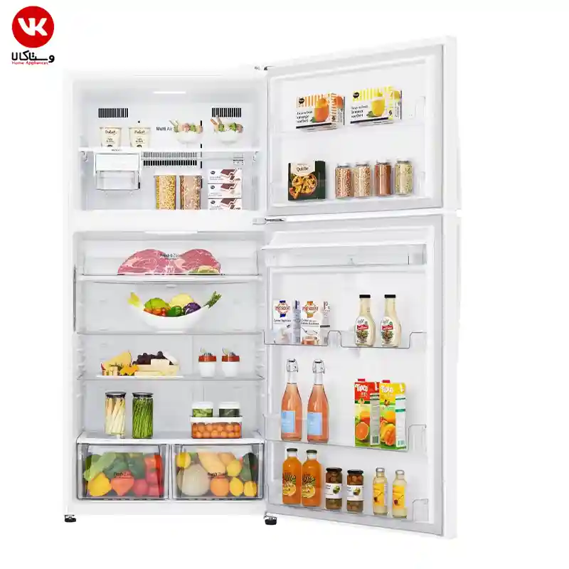 ال جی در طراحی داخلی یخچال دو درب ال جی 832 به جزئیات توجه ویژه ای داشته است. طبقات از جنس شیشه حرارت دیده هستند و تحمل وزن بالایی دارند. همچنین می توانید آن ها را متناسب با اندازه مواد غذایی تنظیم کنید. در قسمت پایین، کشوی مخصوص میوه و سبزیجات با قابلیت کنترل رطوبت تعبیه شده است که مانع از پلاسیده شدن سبزیجات می شود. در درب یخچال نیز چندین محفظه برای نگهداری بطری، تخم مرغ و مواد پرمصرف قرار دارد. یکی از ویژگی های جالب این مدل، محفظه خنک کننده سریع (Fresh Zone) است که دمای پایین تری نسبت به سایر بخش ها دارد و برای نگهداری گوشت تازه یا لبنیات بسیار مناسب است.